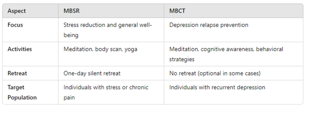 Mindfulness-Based Cognitive Therapy (MBCT): MBCT integrates mindfulness practices with cognitive-behavioral therapy to address depression and anxiety disorders. It’s an 8-week structure, with weekly sessions lasting 2–2.5 hours. Like MBSR, it involves daily home practice.